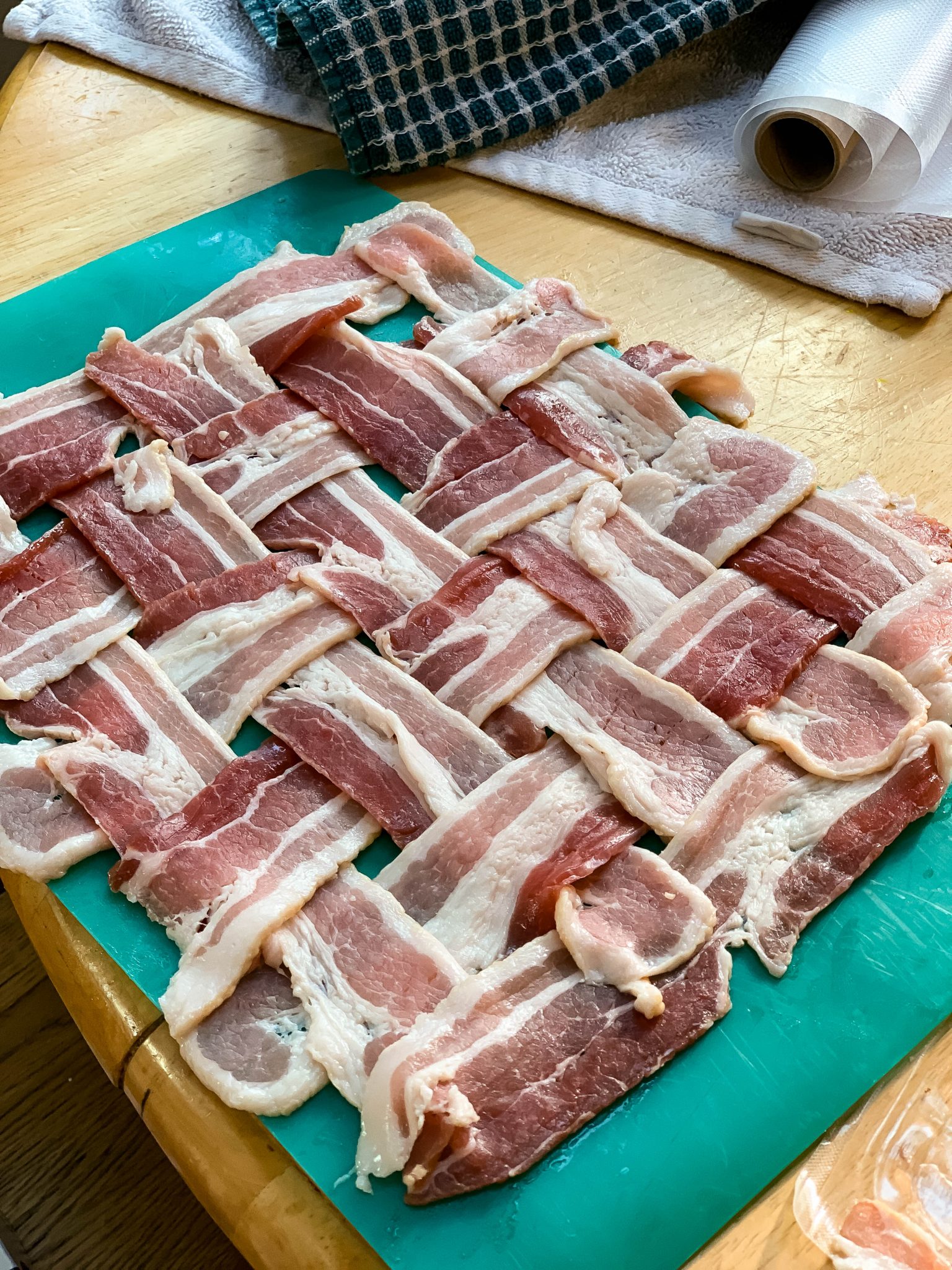 Nestle prepared pork into center of baking sheet, with bacon seam side up.